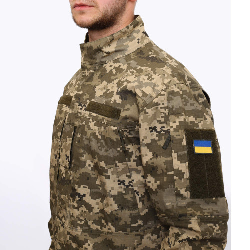 - Рукави: Рукави сорочкового покрою, складаються з верхніх та нижніх частин. Верхні частини рукавів включають передні, середні та задні деталі, що додає анатомічну посадку і зручність. Верхні краї текстильних смуг оброблені швами упідгин з відкритими зрізами, що дозволяє зручно фіксувати предмети поздовжньої форми між смугами та рукавами.